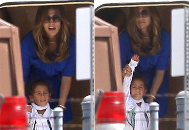 J.Lo pegou a filha no colo e deu um beijinho e entrou no carro para poder se despedir de Max também, antes de embarcar no aeroporto de Van Nuys, na Califórnia. Os gêmeos de seis anos são fruto do casamento da cantora com Marc Anthony.