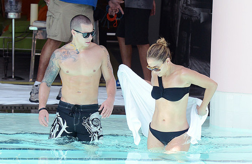 A cantora de 42 anos apanhou "banhos de sol" na companhia dos filhos gémeos (Max e Emme, de 3 anos) e do novo namorado, o dançarino Casper Smart, de 24 anos.